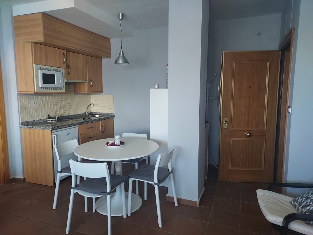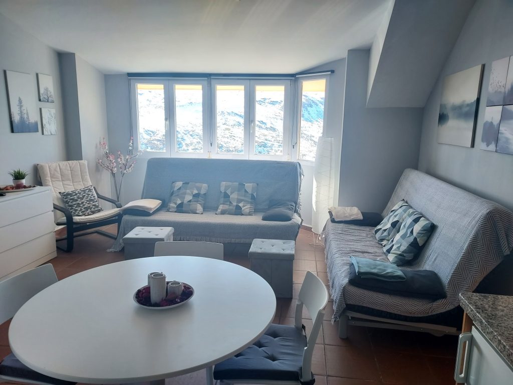 Sofá cama, 140 x 200, mueble de salón con cajones y televisión. Calefacción. Juego de sábanas completo. Cama de matrimonio de 150 x 200. Puerta blindada. Vistas privilegiadas.