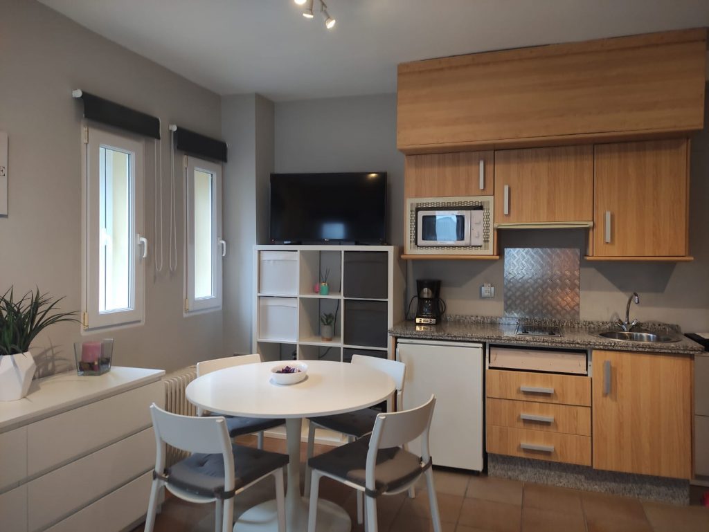 Equipada con nevera, vitrocerámica, campana extractora, fregadero, tostadora, cafetera y microondas. Juego de vasos, copas, platos, sartenes y cubiertos.
